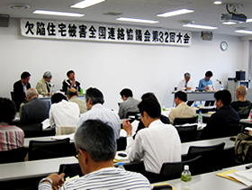 建築士、弁護士、研究者らによって1996年に設立された欠陥住宅被害全国連絡協議会は、現在、北海道から九州まで12の地域ネット、会員約1000名の任意団体であり、年2回の全国大会を開催すると共に例年全国一斉に「欠陥住宅110番」を実施しています。公的団体との連携(8月例会に続いて)